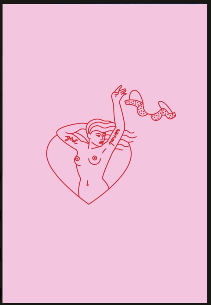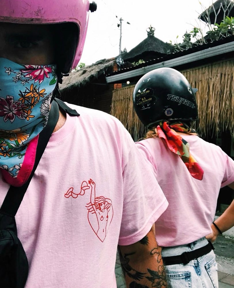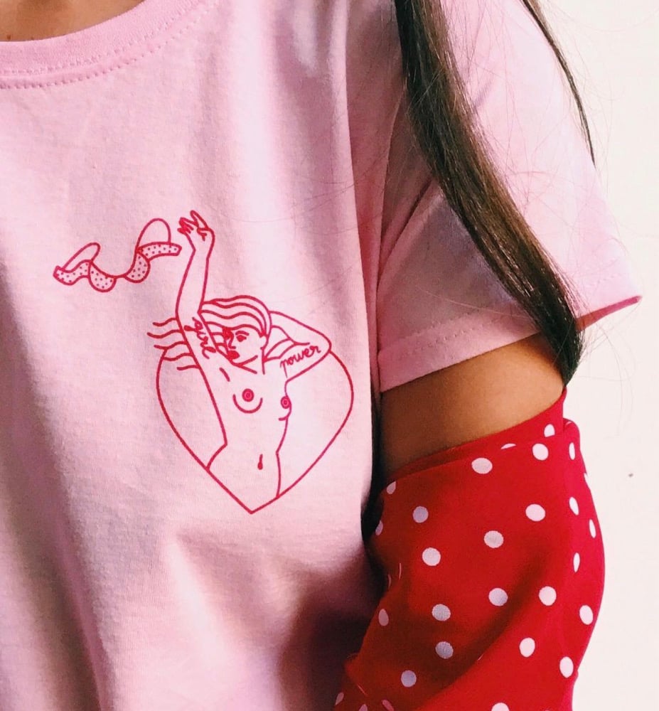 Camiseta unisex 100% algodon. Ilustración por Grace Garcia @gracegarciasalcedo Serigrafiadas a mano, rojo sobre rosa.