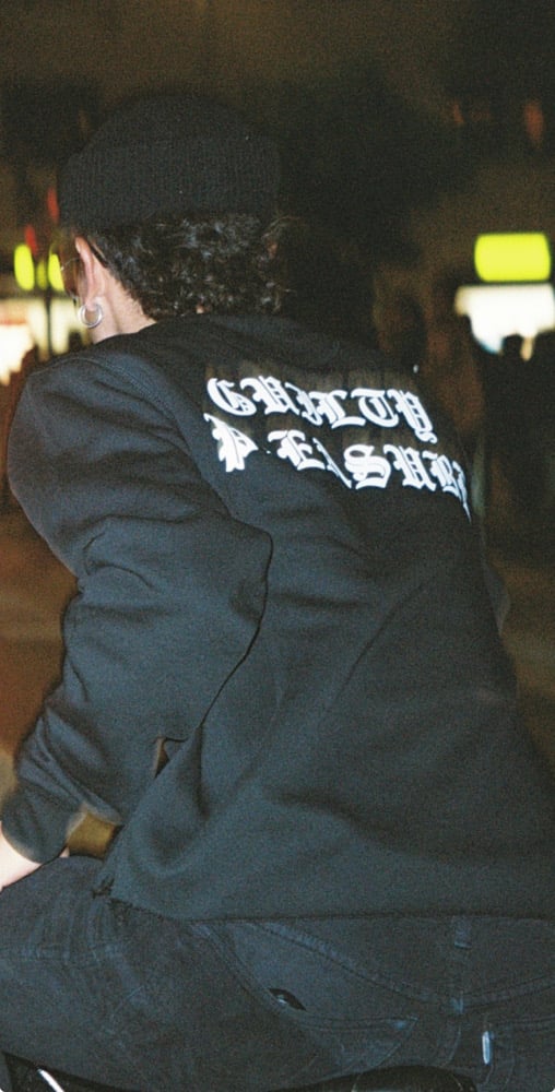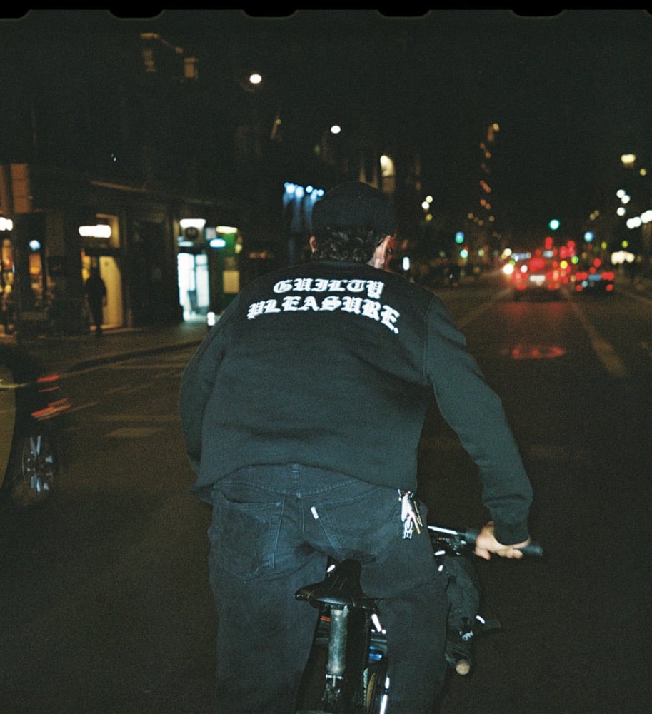 Sudadera de algodón orgánico de color negro. Con serigrafia blanca en la parte trasera. Puños y cuello canalé. Bajo cortado recto sin goma.